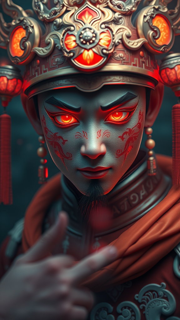 A Chinese character adorned in a fiery costume, their eyes glowing a vivid red, presented in a style of realistic hyper-detailed portraits. This figure is enveloped in a dark bronze and light blue palette, achieved through digital airbrushing techniques that render fantastical, otherworldly visions. The scene is filled with luminous 3D objects that add to the hyper-realism. Intricate details abound, with every stitch and pattern meticulously crafted to convey a sense of depth and wonder. The overall composition combines the ethereal with the tangible, embodying a surreal elegance.