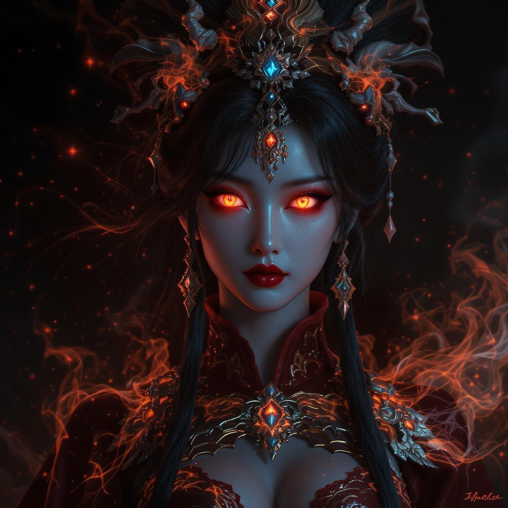 A Chinese character adorned in a fiery costume with striking red eyes, portrayed in the style of realistic hyper-detailed portraits. The imagery combines hues of dark bronze and light blue, using digital airbrushing to create fantastical, otherworldly visions. The portrait features luminous 3D objects, showcasing realistic hyper-detail and intricate design. Despite deliberate imperfections and artistic deviations, the composition maintains a sense of surreal beauty with imaginative creativity, while retaining a focus on the core theme of a fiery, ethereal character.