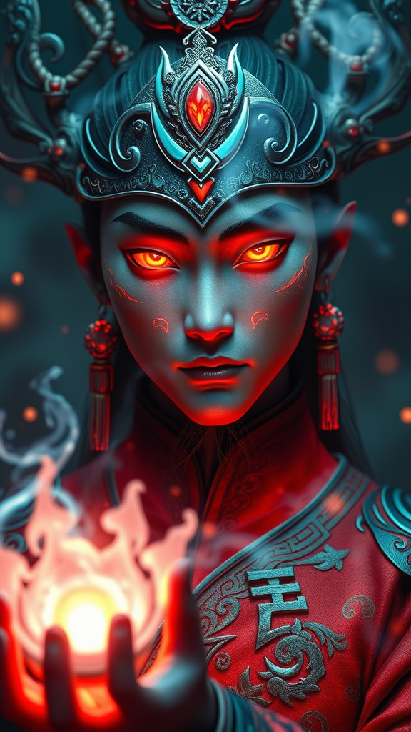 A Chinese character in a fiery costume with glowing red eyes, rendered in the style of a realistic hyper-detailed portrait. The piece employs dark bronze and light blue hues through digital airbrushing, presenting a fantastical and otherworldly vision. The character is surrounded by luminous 3D objects, exhibiting realistic hyper-detail and intricate design. The composition captures an atmosphere of mystique and drama, with wisps of ethereal light adding depth to the scene. The background is subtly blurred to accentuate the character's vivid presence, emphasizing the complex interplay of light and shadow, while maintaining a focus on authentic anatomical proportions and harmonious composition.