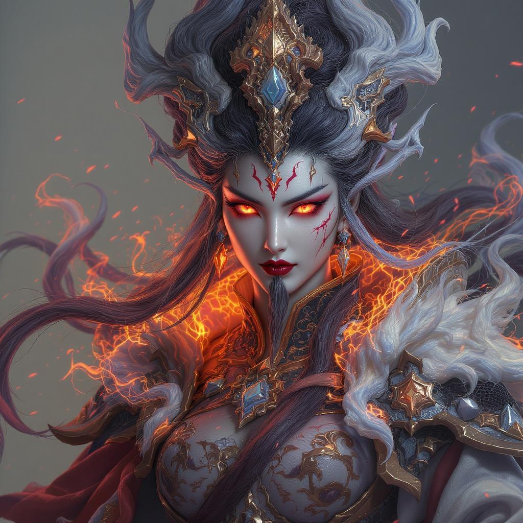 A Chinese character in a fiery costume with red eyes, depicted in the style of realistic hyper-detailed portraits. Dark bronze and light blue hues coexist in a digital airbrushed creation, presenting fantastical otherworldly visions. The figure is surrounded by luminous 3D objects, bursting with intricate detail and hyper-realistic textures. The composition focuses on maintaining correct anatomy, clear and defined features, with a balanced and centered composition. The background remains simple to accentuate the character, free of watermarks, signatures, or any text logos. The character's expression is both captivating and intense, adding to the fantastical atmosphere.