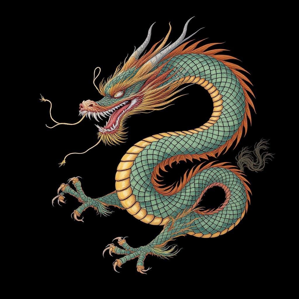 A Chinese dragon depicted in a bold, graphic composition, with its sinuous body elegantly poised in precarious balance. Its scales shimmer in dark green and amber hues, standing out vividly against a deep black background. The dragon is accentuated with touches of light green and red, blending seamlessly into the composition. The overall style is reminiscent of Mark Brooks, combining dynamic movement and intricate details with a vibrant, colorized palette.