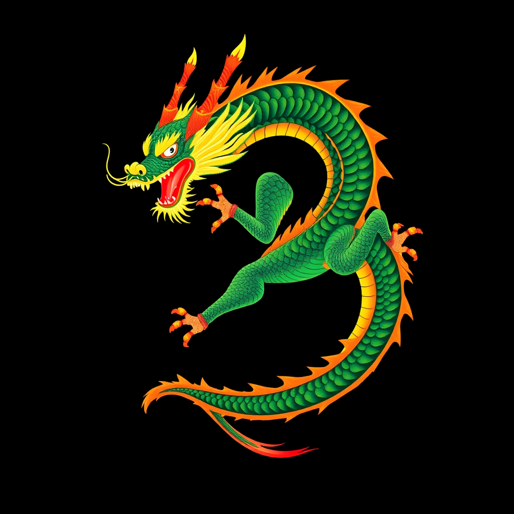 A Chinese dragon depicted in bold, graphic compositions featuring dark green and golden amber hues against a black background, infused with vibrant light green and red highlights. The dragon is poised in a precarious balance, capturing dynamic movement and tension. The style echoes Mark Brooks' intricate detailing and dynamic energy, creating a striking, colorized masterpiece.