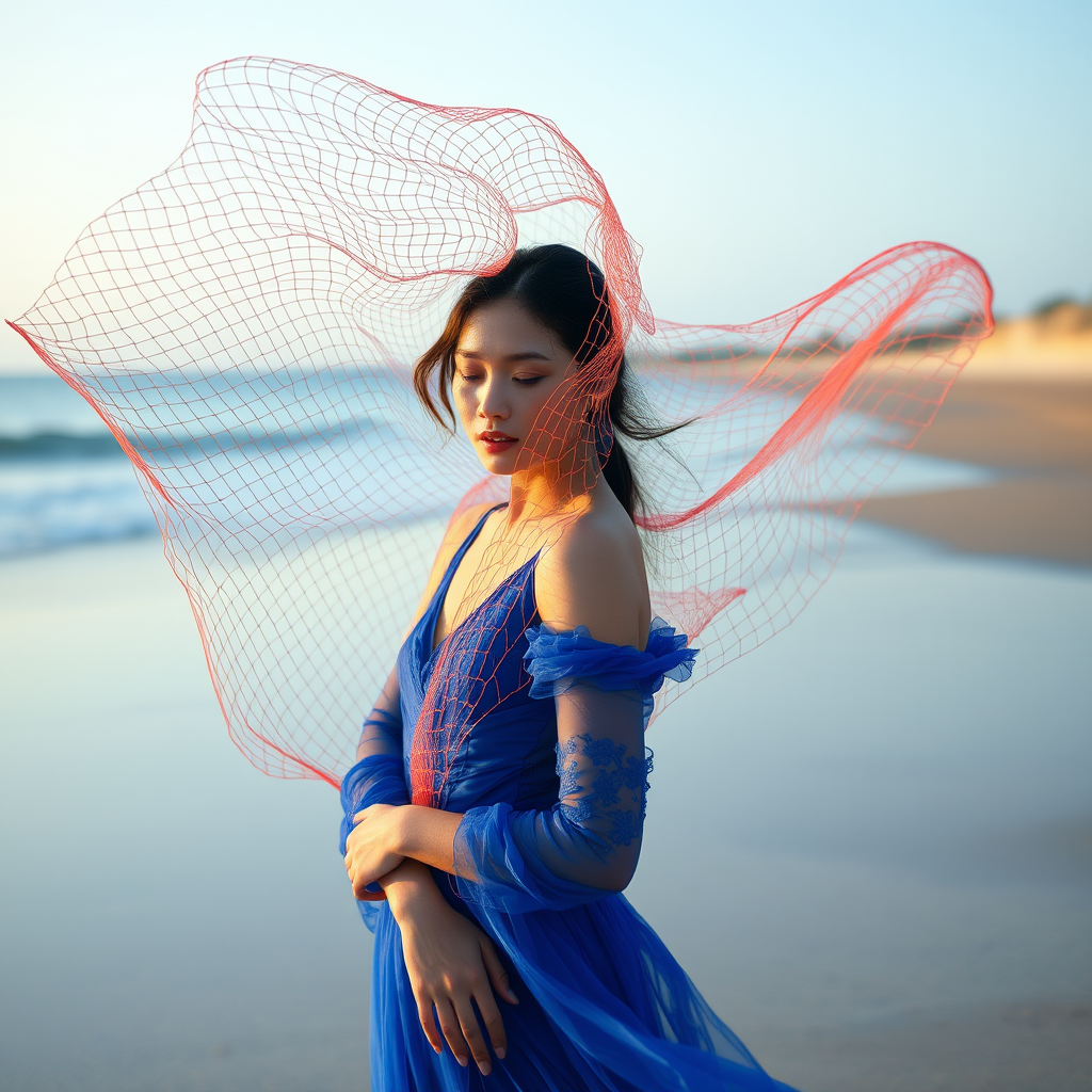 A Chinese fashion model in a striking blue dress stands gracefully on the beach, her features reminiscent of Ren Hang's evocative photography. The scene captures the delicate elegance of Botticelli with environmental artwork that celebrates nature. The vibrant colors of Greg Broadmore's futuristic style add a surreal touch, as ethereal netting surrounds her like a disappearing veil. The blend of artistic influences creates a captivating tableau of beauty and introspection.