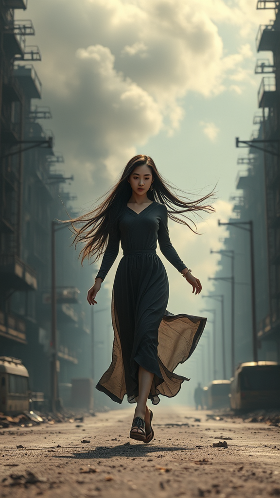 A Chinese girl with flowing long hair walks gracefully through the desolate, dystopian streets, surrounded by smoke-filled skylines and deteriorating cityscapes. The scene is captured in ultra-realistic digital art with web movie lighting, showcasing smooth, studio-quality rendering reminiscent of Unreal Engine 5 and Sinting techniques. The setting is defined by its rusty, ominous atmosphere, with dramatic lighting casting soft yet striking details across her figure. This captivating illustration is presented with film-like ray tracing and sharp focus, encapsulating a fantasy world where cloud-lit skies echo the strokes of a painter. Envisioned in 8k HD and ultra-wide dimensions, the artwork immerses viewers in its expansive and richly detailed panorama.