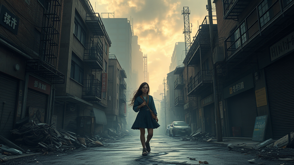 A Chinese girl with long hair strides purposefully amidst dystopian streets, her figure captured in super detail with digital artistry. The scene unfolds with the dramatic lighting of a web movie, studio-quality smooth rendering, and the realism of Unreal Engine 5. Rusted urban remnants and smoke-filled skylines paint a picture of a deteriorating city. The desolate streets are enveloped in ominous cloud-lit fantasy art, conveying a sense of cinematic wonder. Infused with the ambiance of film and ray-traced visuals, the illustration boasts intricate detail, allowing each sharp focus point to shine in 8k HD ultra-wide resolution.