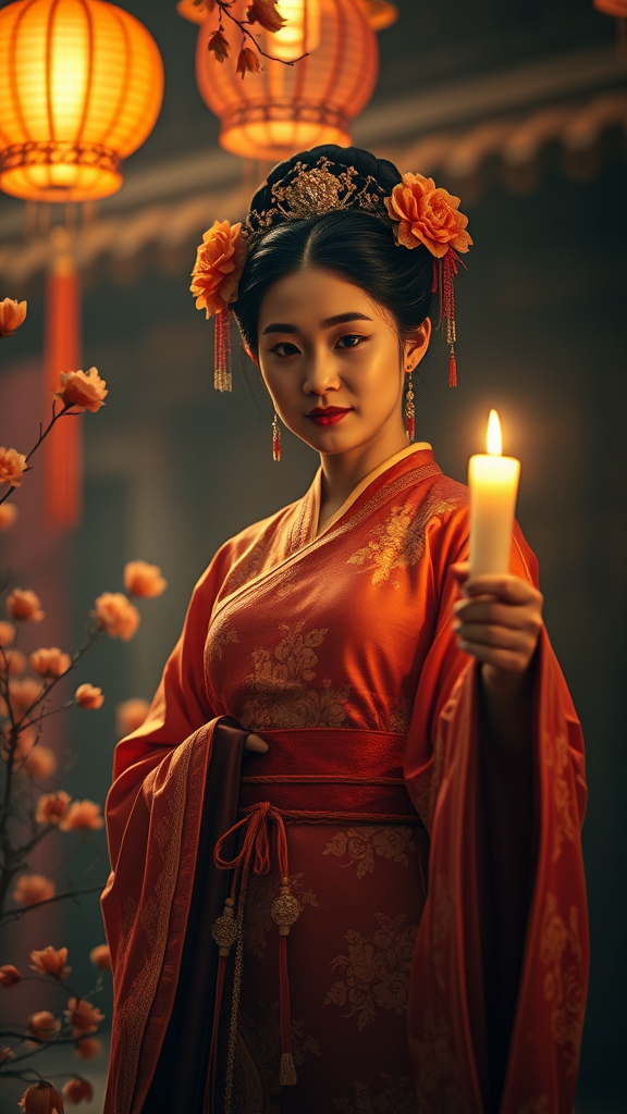A Chinese woman adorned in traditional oriental attire stands gracefully, holding a glowing candle. The scene is enveloped in a palette of dark orange and gold, capturing a romanticized view of historical moments. The atmosphere is infused with a fairycore essence, as if a dreamy historical event is unfolding through the lens of webcam photography. The depiction blends historical reproductions with reimagined traditional techniques, as her dress and surroundings seem to be intricately crafted from delicate, blooming flowers.