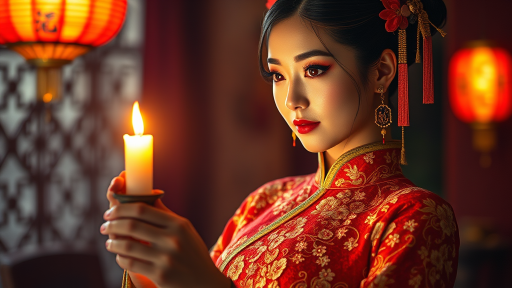 A Chinese woman adorned in traditional oriental attire, holding a glowing candle, depicted in rich dark orange and shimmering gold hues; reminiscent of romantic historical scenes, infused with fairycore elements. The composition captures the essence of a historical event reimagined through a modern lens, infused with webcam photography aesthetics; a blend of historical recreations and traditional artistry, her dress intricately designed with floral patterns, as if crafted entirely from blossoms.