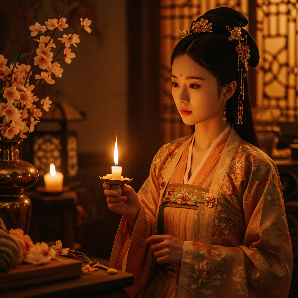 A Chinese woman elegantly dressed in traditional oriental attire holds a flickering candle, bathed in the warm hues of dark orange and gold. The scene evokes a romanticized vision of historical events, blending fairycore elements with the intimacy of webcam photography. Her surroundings are a harmonious blend of historical reproductions and traditional techniques reimagined, with delicate flowers woven into her attire and the setting, enhancing the ethereal atmosphere.