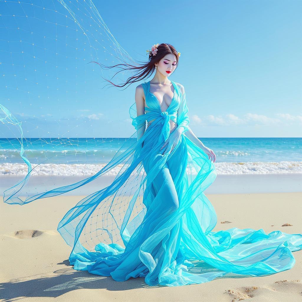 A Chinese woman in a flowing blue dress stands elegantly on the beach, embodying the grace of a fashion model with Botticelli-inspired features. The vivid, bright colors of the scene reflect the environmental artistry of Greg Broadmore, with intricate netting catching the breeze. The dress appears to vanish into the landscape, blending seamlessly with the ocean and sky, creating a dreamlike fusion of nature and human form.