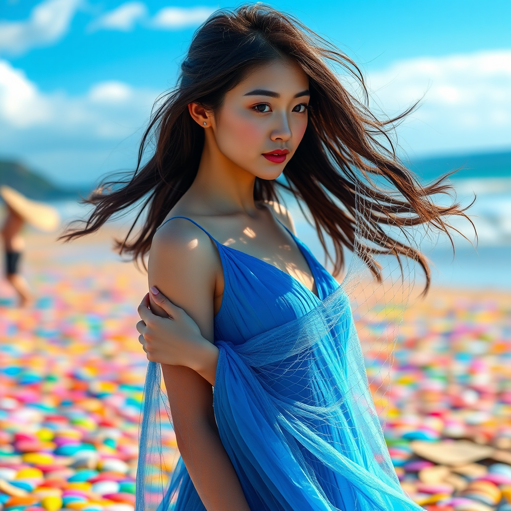 A Chinese woman in a flowing blue dress stands gracefully on a vibrant and colorful beach, her presence evoking the ethereal beauty of Botticelli's masterpieces. Her fashion model features are accentuated by the interplay of light and shadow, reminiscent of Ren Hang's unique style. Intricate netting gracefully drapes around her, blending with the environmental artwork of the scene. The backdrop is a fusion of bright, vivid colors, carrying an otherworldly quality akin to Greg Broadmore's imaginative designs. She appears dreamlike, as though on the verge of disappearing into the symphony of colors around her.
