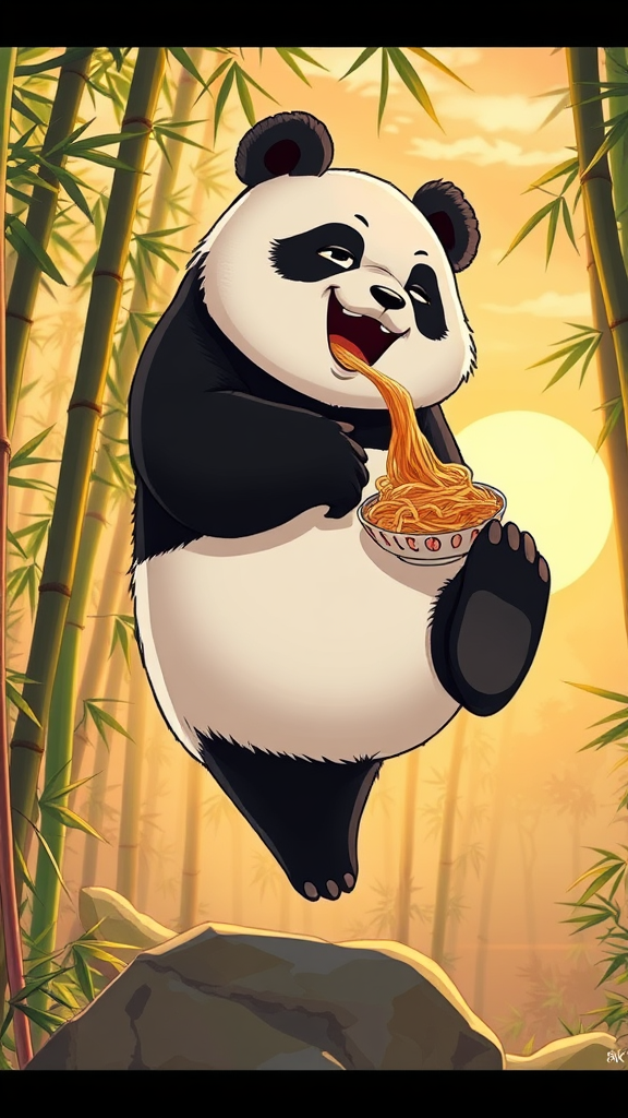 A chubby panda balancing gracefully on one leg, slurping noodles with a delighted expression, illustrated in the dynamic and detailed style of Takeshi Obata Shueisha, capturing the vibrant essence of anime in 8k resolution, surrounded by a lush bamboo forest with a warm golden sunset illuminating the scene.