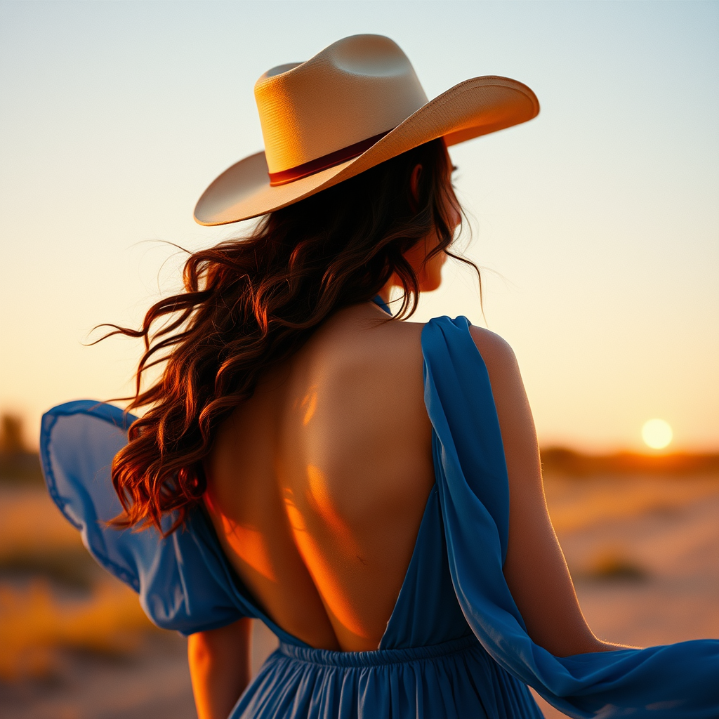 A cinematic 35mm photograph captures a woman in a flowing blue dress paired with a stylish cowboy hat, evoking a vibe that could have been captured by Nathalie Rattner, blending a Tumblr aesthetic. The photograph channels the musical essence of Rex Orange County, highlighting her gracefully exposed back under the sun-drenched Texas sky. There's a dynamic blend of cyan and orange hues illuminating the portrait, reminiscent of a classic Ana de Armas style, with the artistic influences of Maxwell Boas and Jenny Saville subtly present. While the photograph might have been snapped in San Francisco by Lily Frank, it exudes a summery vibrance of 2020, adorned with azure and red tones. The image, low in resolution but rich in texture, possesses the distinct photo grain of analog photography, shot with an aperture of f/2, beautifully encapsulating the essence of the moment.