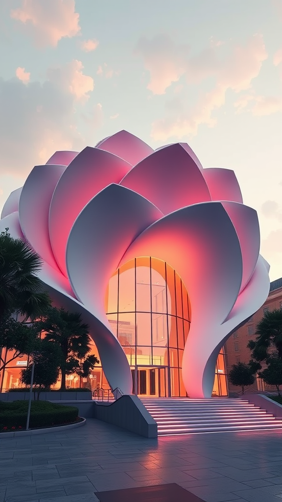 A cinematic 3D exterior rendering of a building inspired by the layered structure of a rose, embodying Zaha Hadid's fluid architectural style. Created using Unreal Engine 5 with ray tracing and post-processing for hyper-realism, incorporating ZBrush sculpting and Substance Painter texturing. The scene captures trending ArtStation aesthetics with cinematic composition and lighting, utilizing the rule of thirds. It features ultra-detailed, low-contrast natural lighting with a light realistic fog and atmospheric depth, enhanced by volumetric and photorealistic lighting effects. This ultra-photoreal scene, created in matte painting style for movie concept art, employs corona, octane, and redshift render techniques to achieve insanely detailed 8k imagery, as seen through a 35mm lens for a stunningly immersive view.