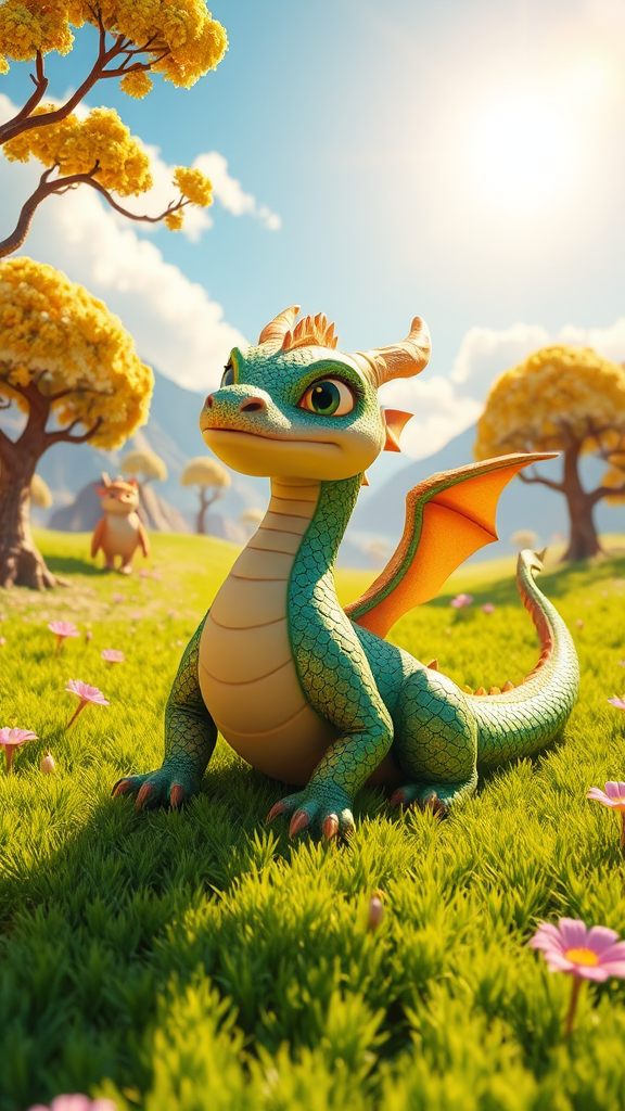 A cinematic 3D image of a vibrant and sunny Pixar-style setting featuring a playful, colorful dragon basking in a sunlit landscape dotted with whimsical trees and flowers, the scene filled with a sense of wonder and adventure, the dragon's scales shimmering in shades of emerald and gold, casting playful shadows on the grassy terrain, creating an enchanting and magical atmosphere.