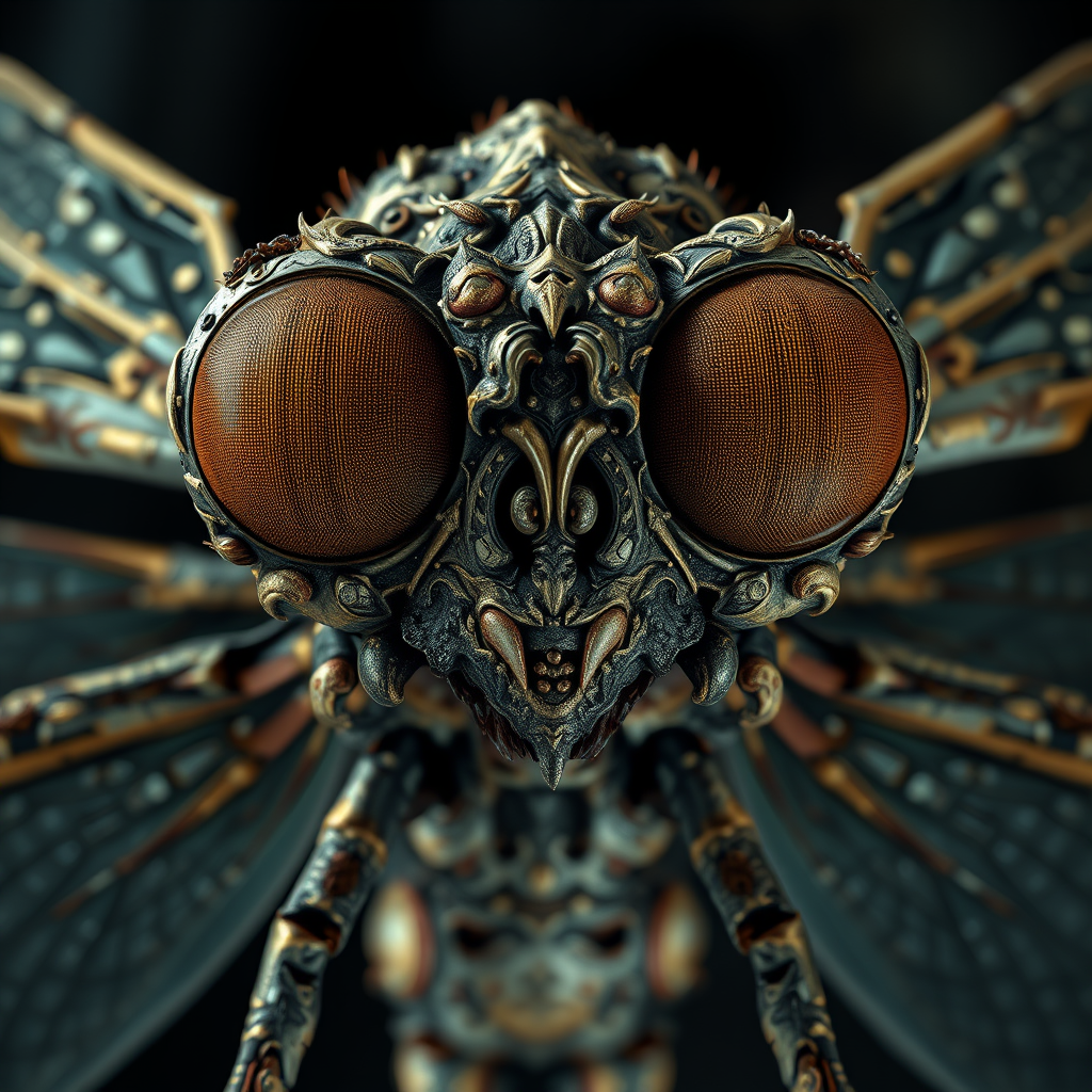 A cinematic, 3D rendered close-up of an ancient humanoid grotesque dragonfly, featuring a rugged, weathered exterior adorned with elaborate, aged patterns and textures. Its enormous, vivid eyes are fully open, exposing a mesmerizing, intricate internal structure. The dragonfly's wings are elegantly spread, showcasing an intricate web of veins. The dim, blurred background serves to highlight the dragonfly as the focal point, adding an aura of mystery and enchantment.