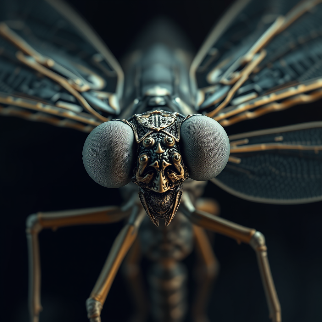 A cinematic, 3D rendered macro image of an ancient humanoid grotesque dragonfly with a dark, weathered exoskeleton adorned with intricate, swirling patterns and textures. Its large eyes are wide open, showcasing a mesmerizing and detailed mosaic of internal structures. The dragonfly's translucent wings are elegantly spread, highlighting a delicate network of interwoven veins. Against a deep, shadowy backdrop that softly defocuses, the dragonfly stands out as the central subject, drawing the observer into its otherworldly presence.