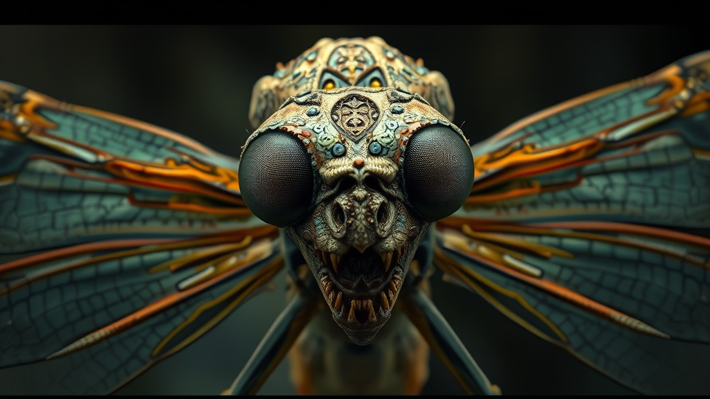 A cinematic, 3D rendered macro photograph of an ancient humanoid grotesque dragonfly with a rugged, weathered appearance adorned with intricate, mesmerizing patterns and textures; its enormous eyes are wide open, showcasing a labyrinthine, complex inner structure. The dragonfly's expansive wings are outstretched, revealing a delicate and beautifully detailed network of veins. Set against a dimly lit, softly blurred background, the dragonfly remains the striking focal point, exuding an aura of mysterious elegance.