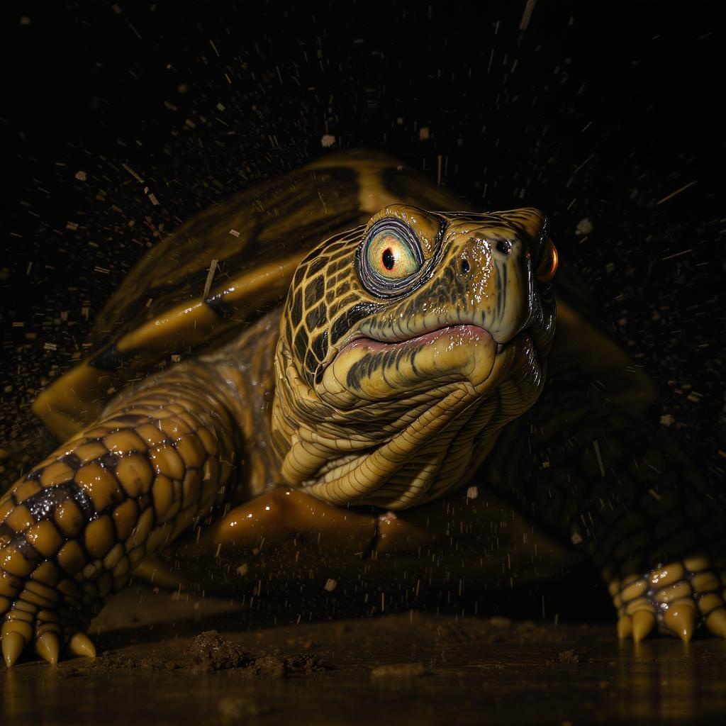 A cinematic 4k epic photograph capturing the essence of a turtle with an expression of sheer velocity, its face illuminated with excitement, captured in ultra-realistic detail. Shot with the rich tones of Kodak Portra 800 film, the turtle's dynamic spirit is vividly brought to life, conveying an unexpected sense of urgency and motion. The 2:3 aspect ratio enhances its stature, showcasing the intricate textures of its shell and skin with dramatic lighting that emphasizes its swift, powerful presence.