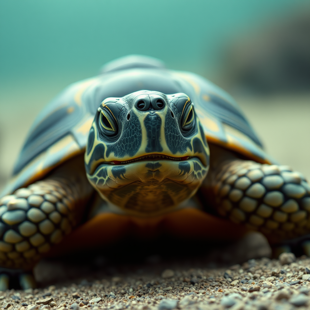 A cinematic 4k photograph capturing a turtle with an expression of intense speed, as if in motion, its face illuminated with a dynamic glow; the shot is highly detailed and ultra-realistic, embodying the rich tones of Kodak Portra 800 film, emphasizing the turtle's rugged shell and smooth skin in a vertical orientation.
