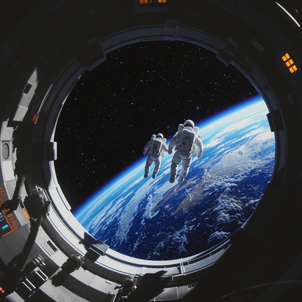 A cinematic 80s-inspired scene captures a bird’s-eye view of two astronauts suspended in a weightless state within a spacecraft. An open circular hatch, adorned with large black wheels and intricate lights, frames one side of the scene. Beyond, the vastness of space stretches out, dotted with a tapestry of stars. The artwork exudes a minimalist and futuristic aesthetic, reminiscent of John Berkey’s visionary style, where details are sleek yet striking. The scene conveys a sense of adventure and exploration, with subtle creative nuances enhancing the timeless feel of the moment.