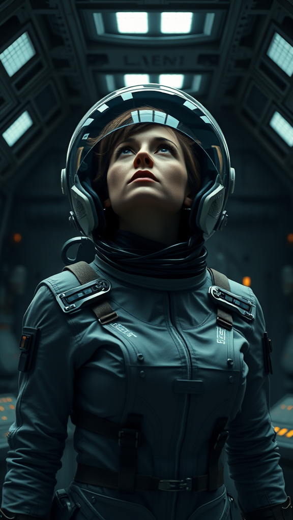 A cinematic 8k wallpaper of Ellen Ripley from the Alien movie, wearing an astronaut suit with the helmet on and visor reflected closed, gazing upward in a dynamic pose. She stands in the intricate interiors of the Nostromo space shuttle, conveying a sci-fi atmosphere. The scene is rendered with Ray Tracing, capturing ultra-detailed, chiaroscuro lighting and hyper-realistic textures for an epic, realistic impression. The promotional art radiates movie quality with an overcast reflection mapping and emphasizes a stoic yet determined demeanor. Shot with a Canon 5D, rendered using Octane for ultra-realism, the image features subtle rim lighting and atmospherics, creating a mesmerizing hyper-photorealistic effect at 8K resolution. The setting is subtly enhanced with glowing control panels, adding depth and intrigue to the ambiance.