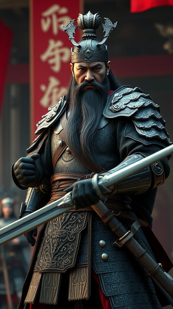 A cinematic action still shot photo of a commanding Chinese general from the Three Kingdoms period, inspired by Guan Yu. The scene features a formidable middle-aged male warrior standing with confidence, his full body adorned in breathtakingly intricate armor. His intense phoenix eyes and flowing long beard exude strength and wisdom. He wields a fearsome weapon with poise, the entire composition achieving photorealistic rendering reminiscent of the latest video game technology. The setting is captured as if shot on a high-end DSLR camera, ensuring vibrant colors and sharp details without compromising the character's essence. Beautifully crafted, the image showcases flawless anatomy and compelling storytelling, avoiding common visual errors and maintaining outstanding quality throughout.