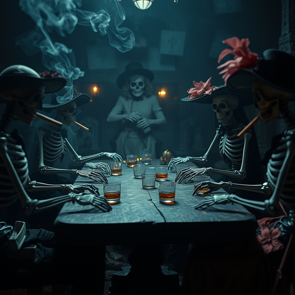 A cinematic and moody scene unfolds in a dimly lit cemetery, where a group of Día de Muertos-themed skeletons and elegant Catrinas engage in a high-stakes poker game. The eerie atmosphere is enhanced by swirling cigar smoke and glistening whisky glasses scattered across a weathered table. With a focus reminiscent of Tim Burton's unique style, the scene is imbued with sharp focus and vivid colors, offering an UHD, HDR10 visual feast. Despite the sharp details, a subtle bokeh effect softens the background, adding depth and mystery. This intricate tableau, captured in incredible 16K detail, avoids the pitfalls of digital artifacts and distractions, maintaining an artistic integrity free from watermarks, logos, or overt digital manipulation, resulting in an immersive and captivating portrayal of a Mexican Day of the Dead gathering.