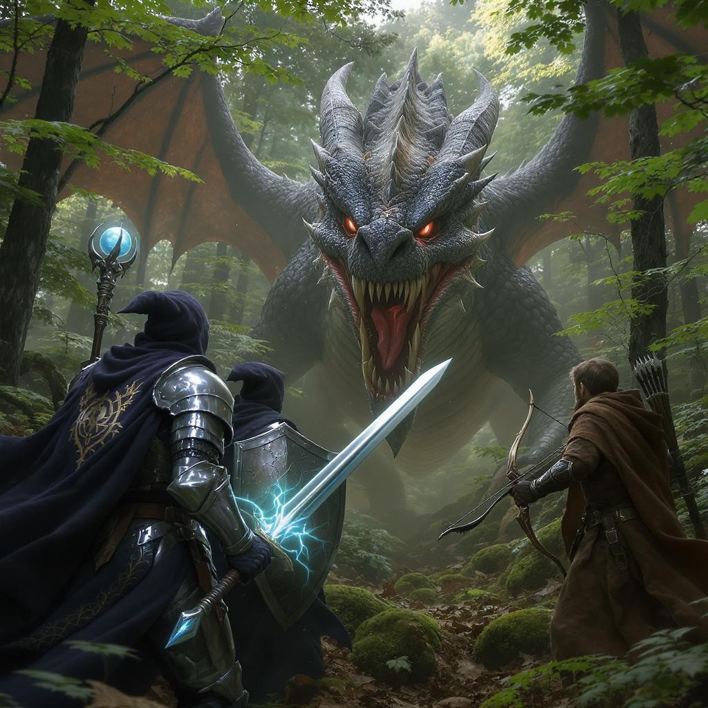 A cinematic and photorealistic image captures an epic fantasy battle scene set in a vibrant yet desaturated forest. At the forefront stands a paladin in intricately detailed armor, his sword and shield subtly glowing with a radiant aura. Beside the paladin, a mysterious wizard, shadowed by a hooded robe adorned with intricate arcane symbols, wields a staff crowned with a softly glowing orb. The wizard's face remains enigmatic, hidden within the shadows of the hood. To their side, a ranger is poised, clad in a finely crafted leather cloak, an elegantly carved longbow at the ready. They face a massive, fearsome three-headed dragon with richly textured scales in muted tones, towering over the scene. Sharp, clear lighting in the forest highlights the crisp details of the characters and the lush environment, enhancing the sense of tension and anticipation in this captivating encounter. The forest surroundings are alive with natural, understated colors, enriching the scene's vivid realism without detracting from the dramatic confrontation unfolding within.