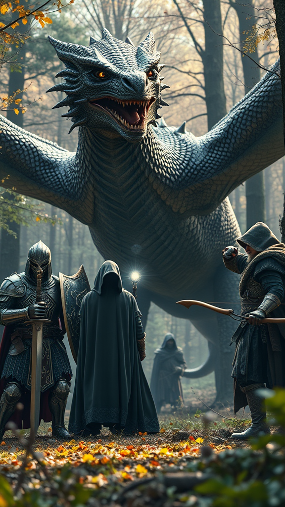A cinematic and photorealistic image of an epic fantasy battle scene in a vibrant but slightly muted forest. The focus is on a valiant paladin wearing intricately designed armor, with a subtly glowing sword and shield in hand. Next to him stands a mysterious wizard draped in a hooded robe adorned with complex arcane symbols, while a softly illuminating orb crowns his staff, casting delicate shadows over his hidden face. To the other side, a skilled ranger is depicted in a detailed leather cloak, armed with a longbow poised for action. Their adversary is a grand, three-headed dragon with elaborately detailed scales in a subdued palette. The forest's lighting is sharp and natural, enhancing the crisp, vivid details of the characters and surroundings, creating a scene that's enchanting yet slightly melancholic.
