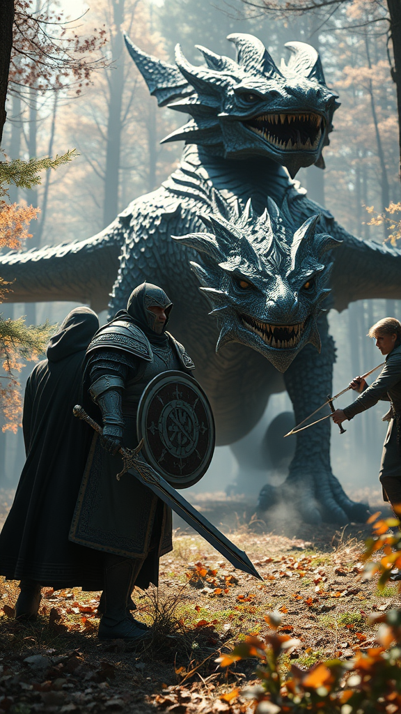 A cinematic and photorealistic image of an epic fantasy battle scene unfolds in a vibrant, yet desaturated forest. Central to the scene is a paladin adorned in detailed, ornate armor, holding a subtly radiant sword and shield that gleam faintly. Standing beside him is a mysterious wizard shrouded in a hooded robe, with intricate arcane symbols etched along the fabric. The wizard's face remains obscured by the shadowy hood, adding an air of enigma. To the other side, a skilled ranger, clad in a finely detailed leather cloak, stands poised with a longbow at the ready. They confront a massive, awe-inspiring three-headed dragon, its scales textured with rich detail, yet muted in color. Sunlight filters through the forest canopy, casting sharp, clear lighting that highlights the crisp details of the characters and their natural surroundings. The scene is vividly depicted, with each element contributing to the dramatic and immersive atmosphere.