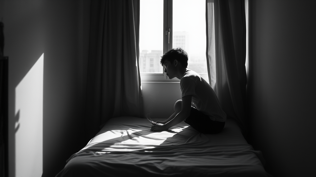 A cinematic black and white scene captures an Asian boy sitting pensively on the edge of a narrow bed, a wisp of smoke curling from the cigarette in his hand. The room is compact, with an open window that allows diffused light to filter in, partially obscured by heavy curtains. Shadows dance gently across the walls, creating an atmosphere of introspection and solitude, as the faint sound of distant city life drifts through the window.