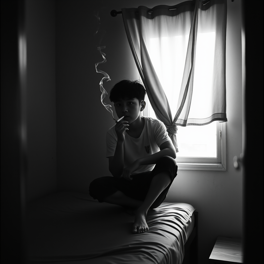A cinematic black and white scene captures an Asian-looking boy perched on the edge of a narrow bed, tendrils of smoke curling upward from a cigarette loosely held between his fingers. The room is cramped, its sparse decor accentuated by the shadows. Light filters through a partially drawn curtain hung over the open window, casting soft, diffused patterns across the walls. The atmosphere is heavy with contemplation, the air thick with the scent of tobacco.