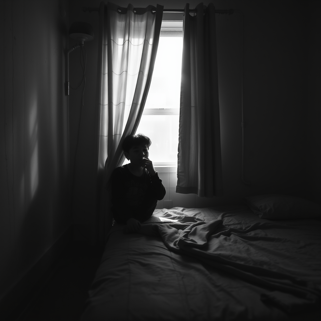 A cinematic black and white scene captures an Asian-looking boy sitting on the edge of a worn-out bed, exhaling smoke in the hazy room; the small space is illuminated by dim, dappled light filtering through a partly drawn curtain concealing the open window, casting intricate shadows on the walls; the furniture is sparse, adding to the moody, introspective atmosphere.