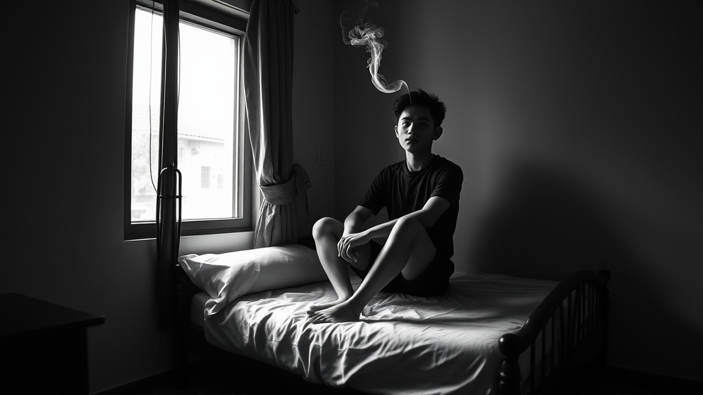 A cinematic black and white scene features a young Asian man perched on the edge of a modest bed, a contemplative expression on his face as tendrils of smoke curl upwards. The compact room is sparsely furnished, the window partially open to invite a fractured symphony of light and shadow as faint rays stream in from outside, diffused and softened by the fluttering curtain. A gentle breeze stirs the air, adding a sense of quiet introspection to the intimate, moody atmosphere.