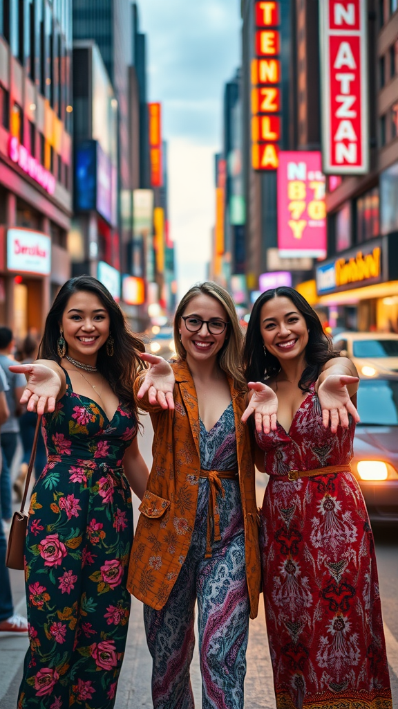 A cinematic capture of three women standing on a bustling city street, their hands confidently reaching towards the camera. The urban backdrop is alive with neon lights and moving traffic, casting a kaleidoscope of colors around them. The women are dressed in vibrant, eclectic outfits that reflect their unique personalities. Their expressions are joyful and full of life, embodying the spirited energy of the downtown scene as evening descends.