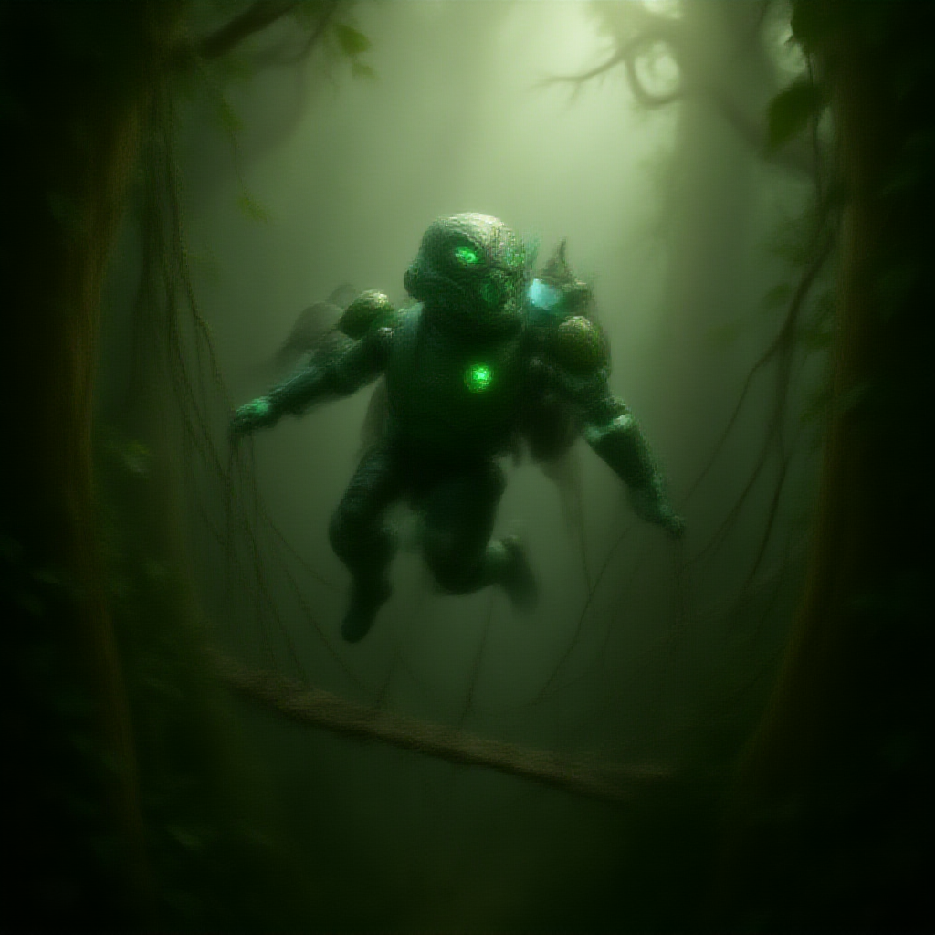 A cinematic CGI render of a green Bionicle Toa of Air robot with vivid green eyes and an intricately designed mask, dynamically leaping across a series of hanging bridges in the lush, treetop village of Le-Koro. The air is alive with movement as vines sway gracefully, and leaves, kissed by the dappled sunlight, cascade gently to the forest floor. The scene captures the thrilling essence of adventure, with the Toa’s agile form frozen mid-air amidst a backdrop of towering trees, their trunks and branches sprawling in all directions, weaving an enchanting and wild tapestry.