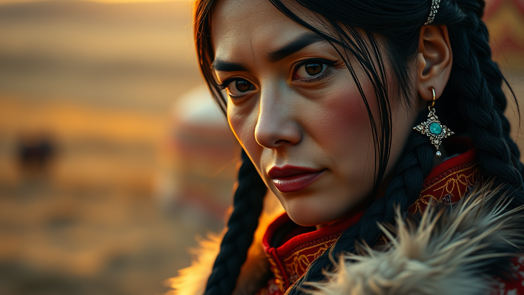 A cinematic close-up of a Mongolian woman in traditional attire, captured at golden hour with soft, warm lighting. The focus is on her expressive almond-shaped dark eyes and high cheekbones, framed by long, jet-black hair styled in intricate braids adorned with silver and turquoise ornaments. Her deel is vividly detailed, showcasing red and gold embroidery with fur accents at the collar and cuffs. The background is artistically blurred, suggesting the vast Mongolian steppe and softly glowing yurts under the warm hues of a setting sun, highlighting the depth and emotion of the scene.