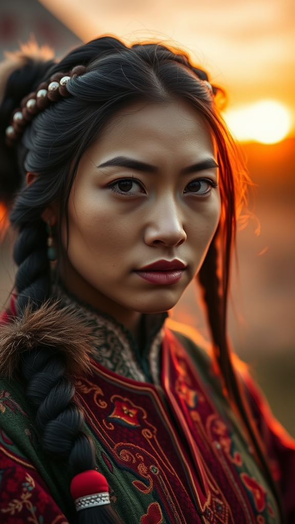A cinematic close-up of a Mongolian woman in traditional attire, captured at golden hour with a warm, soft glow. Her expressive almond-shaped dark eyes and high cheekbones are framed by long, jet-black hair styled in intricate braids adorned with silver and turquoise ornaments. Her deel is richly detailed, showcasing vibrant red and gold embroidery with fur accents at the collar and cuffs. The background is artistically blurred, subtly suggesting the vast Mongolian steppe and softly glowing yurts under the warm hues of the setting sun, enhancing the depth and emotion of the scene.
