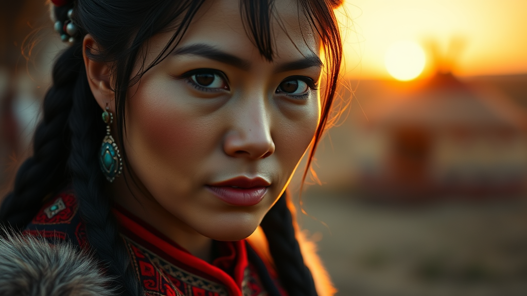 A cinematic close-up of a Mongolian woman in traditional attire, captured during the golden hour with warm, soft lighting. Her expressive almond-shaped dark eyes and high cheekbones are prominently featured, framed by long, jet-black hair intricately braided with silver and turquoise adornments. The vivid deel she wears is richly detailed, showcasing red and gold embroidery with fur accents at the collar and cuffs. The background is artistically blurred, hinting at the vast Mongolian steppe and softly glowing yurts under the warm hues of a setting sun, enhancing the scene's depth and emotion.
