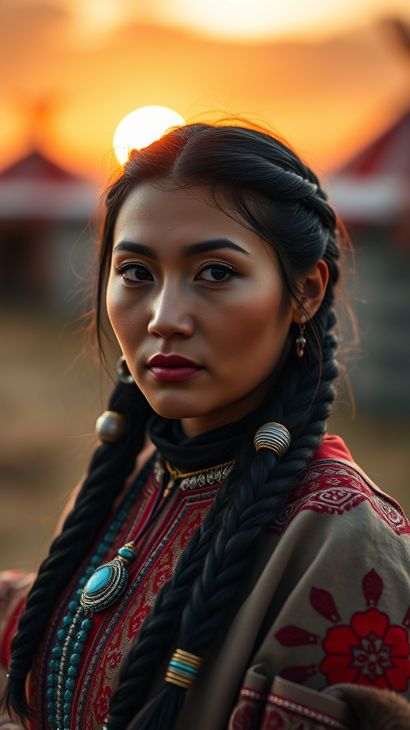 A cinematic close-up of a Mongolian woman in traditional attire, captured at golden hour with warm, soft lighting. Her expressive almond-shaped dark eyes and high cheekbones are framed by long, jet-black hair styled in intricate braids adorned with silver and turquoise ornaments. Her deel is detailed, showcasing red and gold embroidery with fur accents at the collar and cuffs. The background is artistically blurred, hinting at the vast Mongolian steppe and softly glowing yurts under the warm hues of a setting sun, emphasizing the depth and emotion of the scene.
