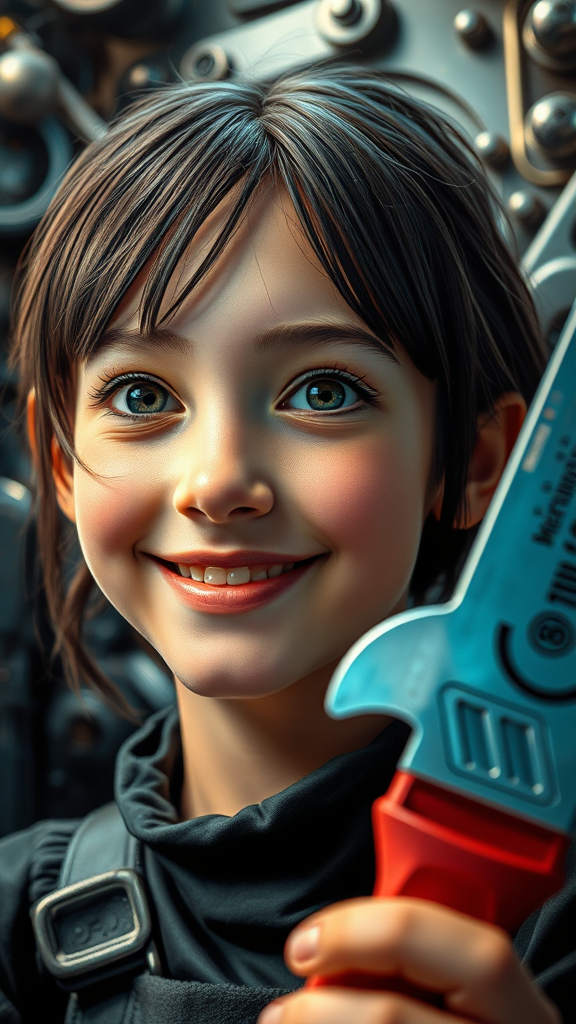 A cinematic close-up portrait of a young girl mechanic, radiating happiness and energy, as she enjoys her afternoon in a meticulously detailed dystopian mechanical interior. Her face is cute and innocent, featuring ultra-detailed eyes, a nose, and lips. She is surrounded by an intricately designed mechanical backdrop, with tools like a wrench and screwdriver showcased prominently. The vibrant colors of the 2D vector illustration create a stunning masterpiece, blending inspiration from "Ghost in the Shell." Despite the ultra-detail and beauty, the scene avoids distortions or deformations, focusing on balance and precision in the composition.