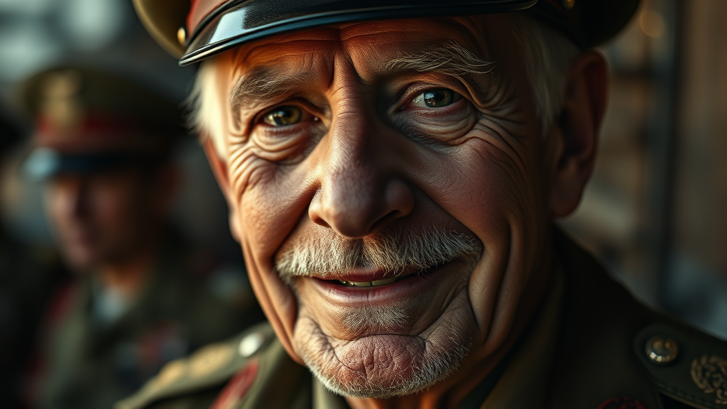 A cinematic close-up portrait of an 85-year-old resilient and decorated general, clean-shaven, with a gentle smile directed at the camera. The atmosphere is stoic yet warm, captured in striking 4k detail, reminiscent of classic film photography. The scene is richly detailed and evocatively dark and moody, with a background hinting at a storied past.