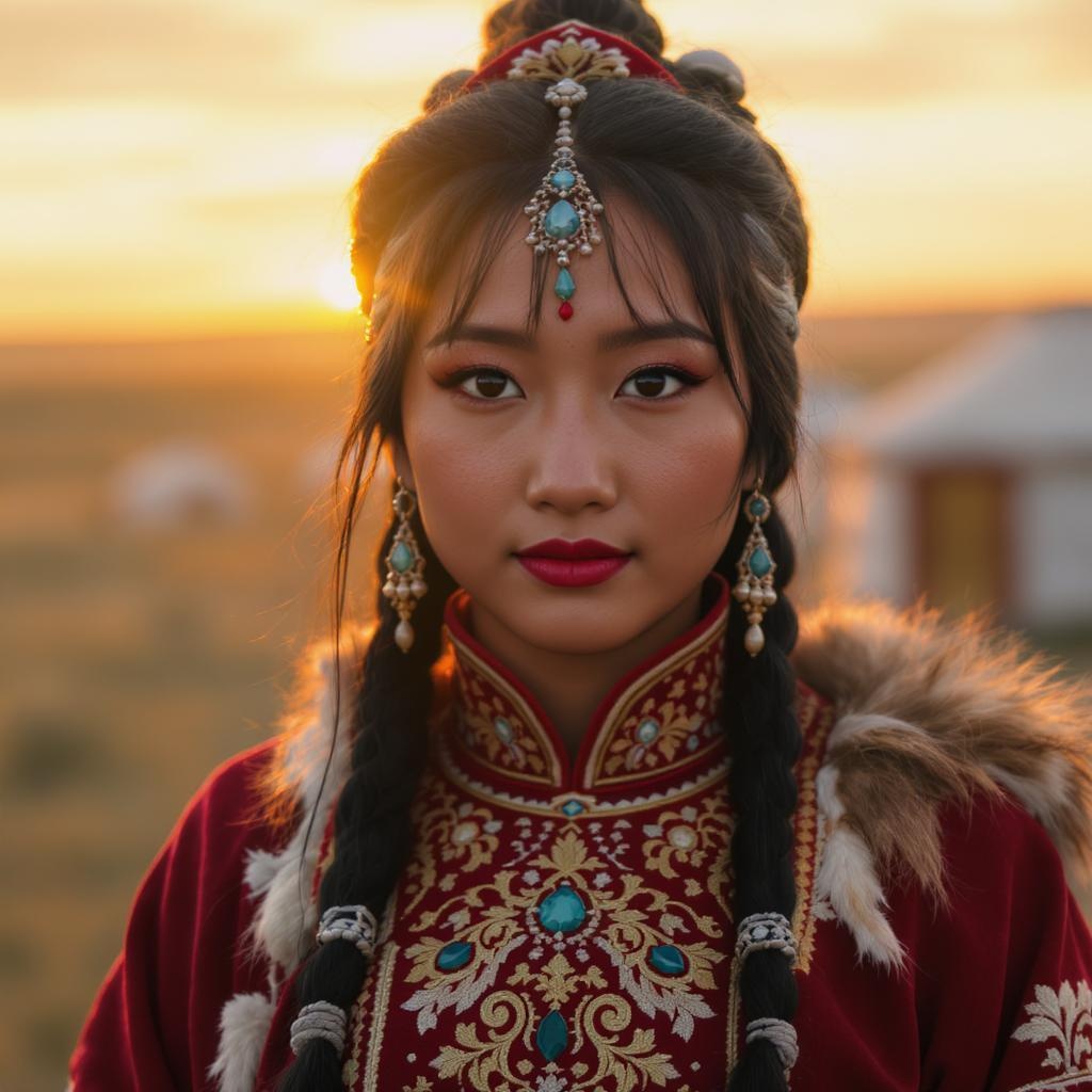 A cinematic close-up showcases a Mongolian woman in traditional attire, captured at golden hour with warm, soft lighting. Her expressive almond-shaped dark eyes and high cheekbones are prominently featured, framed by long, jet-black hair styled in intricate braids adorned with silver and turquoise ornaments. The deel she wears is richly detailed, featuring vibrant red and gold embroidery with fur accents at the collar and cuffs. The background is artistically blurred, hinting at the vast Mongolian steppe and softly glowing yurts under the warm hues of a setting sun, enhancing the depth and emotion of the scene. Gentle creative touches add subtle uniqueness while preserving the core essence of the captivating moment.