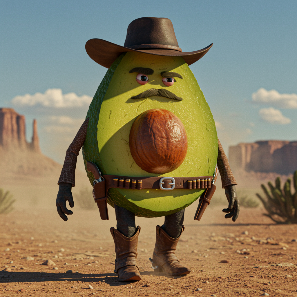 A cinematic depiction of a rugged avocado-shaped desperado, set against a sun-bleached wild west backdrop, with intricate detailing capturing the texture and features of the character's skin and attire, dust swirling in the air, worn cowboy hat tilted over one eye, leather boots kicking up dirt, holster hanging loosely at its side, vibrant landscape fading into the horizon, shot with a hyper-realistic, photographic quality in stunning 8k resolution.