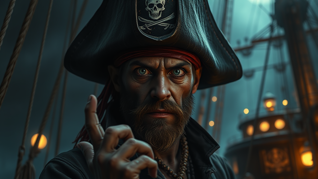 A cinematic depiction of a space pirate in the style of Richard Corben, wearing a weathered Jolly Roger hat. He stands on the deck of an intricate steampunk ship, bathed in dramatic and intense lighting that highlights every minute detail. The scene is shrouded in gloomy illumination adding a sense of mystery. The pirate's eyes are captivating yet peculiar, with slightly deformed irises and pupils that give him a cross-eyed appearance. His facial features appear cloned, giving him an enigmatic and unsettling aura. His hands display curious mutations, with extra fingers arranged in a surreal yet intriguing manner. This UHD, HDR image exudes an intense, cinematic atmosphere, reminiscent of 16k resolution clarity. The colors are rich and deep, drawing viewers in, yet the overall composition avoids low resolution, text, signatures, or any out-of-frame distractions, keeping the focus solely on the mesmerizing, detailed world of this space-faring rogue.