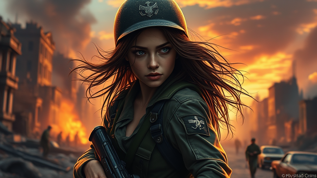 A cinematic digital painting of a striking young female soldier in an aggressive stance, her long hair cascading down, wearing rugged military gear and attire. Set against a WW2 war-torn cityscape at sunset, the scene is highly saturated and intricately detailed, capturing the chaos and beauty of wartime ruins. The style is reminiscent of a vintage movie poster, with a touch of film grain and intentional blurriness for dramatic effect, accompanied by subtle noise and an artistic watermark in the corner.