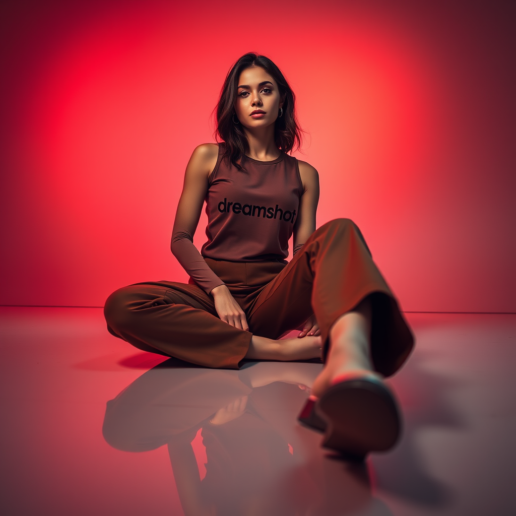 A cinematic fashion photograph captures a woman confidently sitting on a polished studio floor, the perspective wide and low to emphasize her powerful presence. She wears a sleek Dreamshot heattech top prominently showcasing the "Dreamshot" logo in bold letters, paired with stylish brown chinos. The background is an elegant gradient blend of deep red, soft pink, and warm orange, casting a vibrant yet sophisticated aura around her. The lighting enhances her poised silhouette, while subtle shadows add depth to the scene. The overall composition conveys a modern, dynamic essence, embodying both the innovative spirit and luxurious appeal of Dreamshot's fashion brand.
