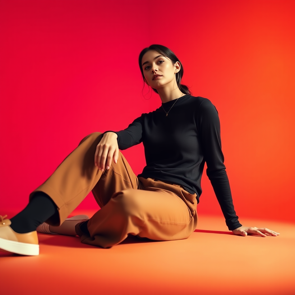 A cinematic fashion photograph capturing a woman casually seated on the floor, showcasing the simplicity and elegance of Uniqlo's style. She is wearing a Uniqlo Heattech top paired with stylish brown chinos, exuding a modern, laid-back vibe. The image is captured from a wide, low angle to emphasize the relaxed pose and the contemporary feel of the outfit. The background features a captivating gradient of warm hues, smoothly transitioning from deep red to vibrant pink and soft orange, set in a sleek studio environment that highlights the brand's commitment to minimalistic yet impactful design.