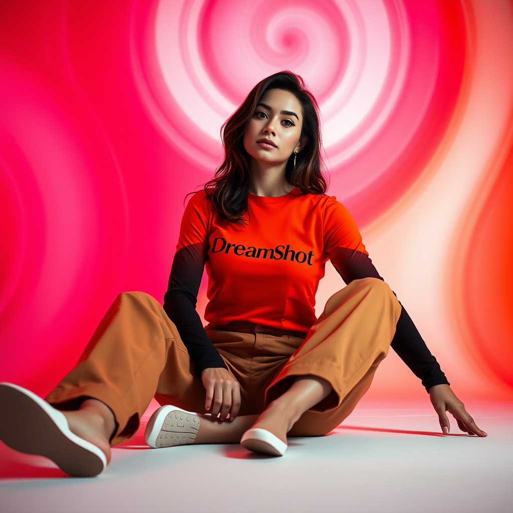 A cinematic fashion photograph featuring a confident woman seated on the floor, showcasing a Dreamshot heattech top emblazoned with a prominent "Dreamshot" logo. She's paired this with stylish tan chinos. The low, wide-angle shot accentuates her poise against a vibrant studio backdrop, where a harmonious gradient of deep red, playful pink, and warm orange swirls, casting a modern, dynamic aura around the model. Her expression exudes elegance and innovation, embodying the Dreamshot ethos.