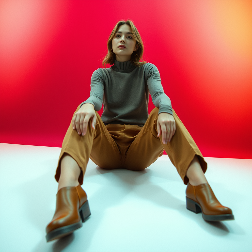 A cinematic fashion photograph featuring a woman in a Uniqlo HeatTech top and brown chinos, seated elegantly on the floor. Captured from a wide and low angle, the scene exudes a sense of modern style and comfort. The background features a smooth gradient of red, pink, and orange, enhancing the studio setting with a warm and inviting ambiance. Her relaxed pose and confident expression embody the effortless blend of fashion and functionality unique to Uniqlo.